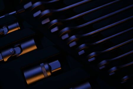 auto car toolbox lit with blue and warm yellow light on dark luxury background