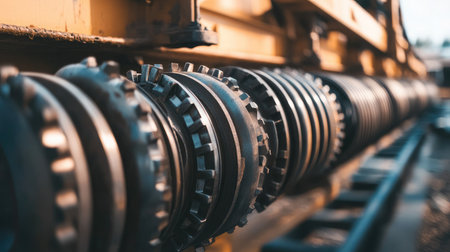 Close up view of complex interlocking industrial gears working together in a seamless mechanism, showcasing the beauty of engineering and precision