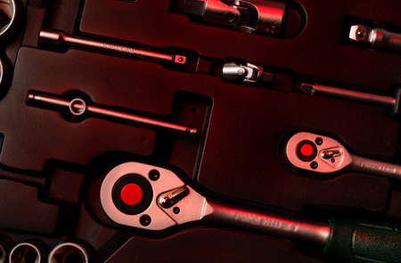 A lot ot ratchet for end heads isolated on red background with copy space. Shop banner with construction tools. New Year or Christmas festive backdrop. Useful instrument for repair auto or house.