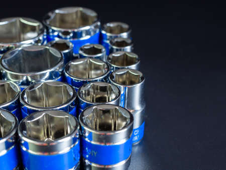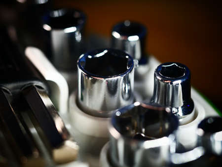 Mechanic essential instruments. Closeup of chrome wrench tools organized in box.