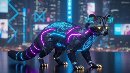 A digitally rendered civet cat displays cybernetic enhancements with neon light patterns across its body. The image showcases a futuristic design aesthetic with a dark color palette. The composition may be suitable for promotional materials, visual concepts, and creative projects that demand a high-tech theme.