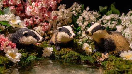 This image presents three badger figurines amidst an arrangement of white and pink flowers and lush green moss. The composition is well-lit, with a shallow depth of field, emphasizing the foreground. It could be used in various commercial applications, including editorial content and design projects. The style evokes a natural, slightly whimsical aesthetic.
