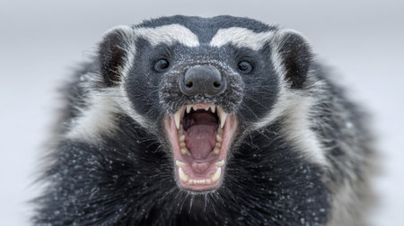 A fierce badger shows its teeth in a striking close-up, illustrating the powerful emotions of wildlife in its natural winter habitat, covered in snow.