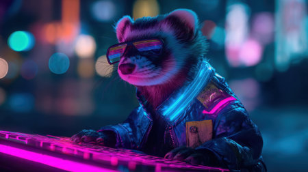 A raccoon wearing stylish sunglasses and a glowing jacket types on a colorful keyboard in a bustling urban environment filled with bright lights and neon colors.