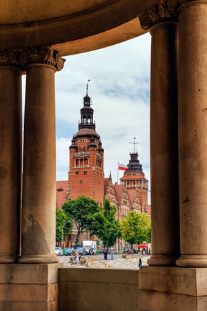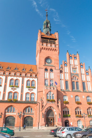 Slupsk, Poland - September 22, 2020: Clock tower of Town Hall in Slupsk.