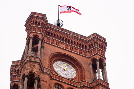 Berlin red town hall with Berlin flag flying in the cloudy sky. Detailed view of Rotes Rathaus clock tower, iconic landmark featuring ornate brickwork representing the city history. Copy space