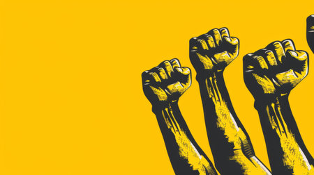A dynamic group of clenched fists rise against a vibrant yellow backdrop.