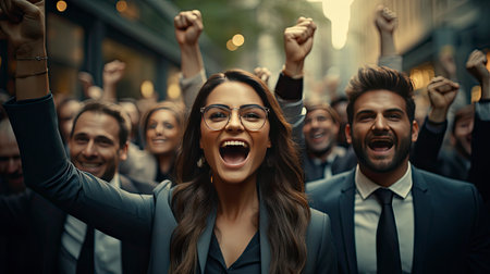 Energetic business team celebrating victory with joyous expressions and raised fists