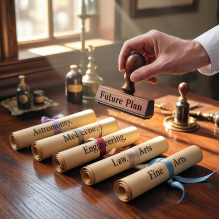 The a hand using a wooden stamp to mark Future Plan on a series of rolled diplomas laid out on a wooden desk. The diplomas represent various academic fields, including astronomy, medicine, engineering, law, arts, and fine arts. Each diploma is tied with a ribbon in different colors. The desk is adorned with vintage bottles, ink, and a quill, suggesting a scholarly or setting. The scene is bathed in warm light coming through a window, creating a serene and contemplative mood.