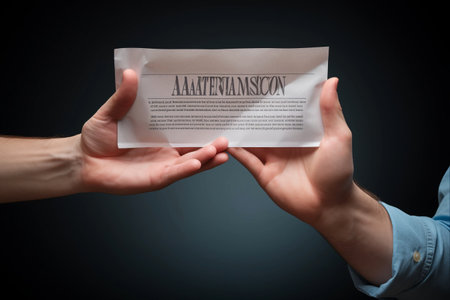 The image depicts a significant moment where a finalized adoption certificate is being handed over from one person to another. The certificate features official seals and signatures, signifying the completion of an adoption process. The hands of the individuals are prominently shown, emphasizing the importance and emotional weight of the document being exchanged.