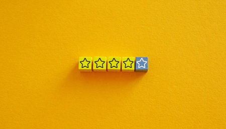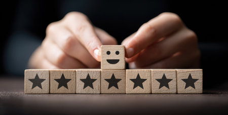 A close-up view shows hands carefully placing a smiling face block above star-marked blocks. The composition has soft lighting on a dark background. This visual could be used to represent positive customer experience, feedback, or quality assurance. Potentially suitable for commercial or editorial applications.