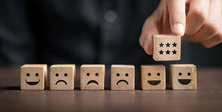 Customer feedback, service rating, satisfaction, customer experience concept. Evaluation for improvement product and service. Hand puts wooden cubes with emotions satisfaction meter icons.