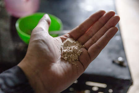 Indian horlicks powder in left palm in grocery store at Thangu and Chopta valley in winter in Lachen. North Sikkim, India.