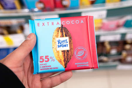 Tyumen, Russia-November 22, 2020: chocolate Ritter sports in a hypermarket close-up. Ritter Sport was founded in 1912 in Stuttgart-bad Cannstatt, Germany