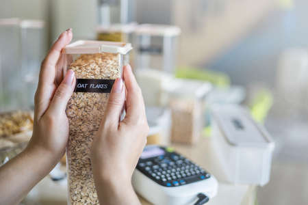 Closeup female hands applying printing sticker with oat flakes title on transparent plastic case