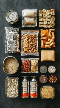The top view of the food kit includes water pouches, pasta and sealed food items perfect for emergency situations