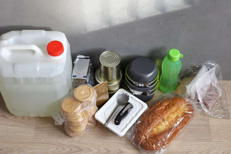 Set of food essentials to emergency, drinking water, with copy space
