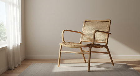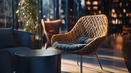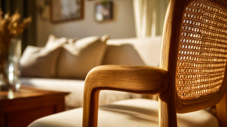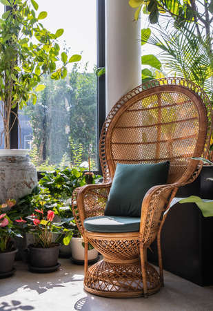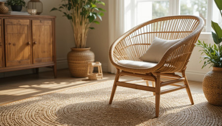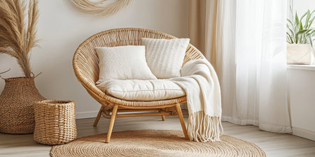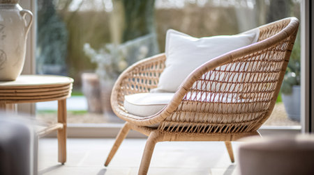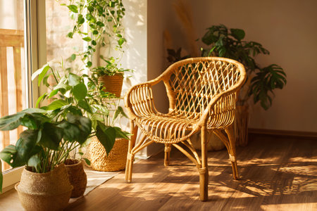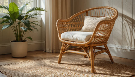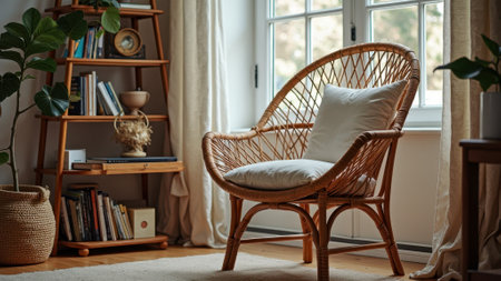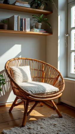 Comfortable rattan chair basking in sunlight, creating a cozy and inviting atmosphere in a stylishly decorated interior