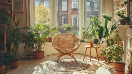 A serene indoor setting featuring a rattan chair draped with a soft blanket. The warm sunlight filters through the window, illuminating various lush plants.