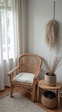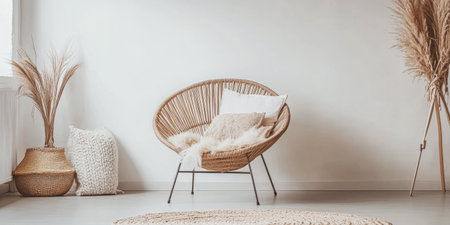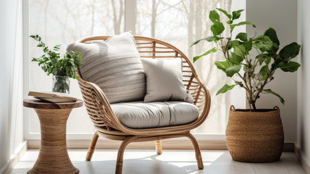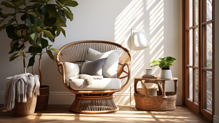 Cozy scandinavian living room with rattan chair and minimalist decor. That the image is generated using AI.