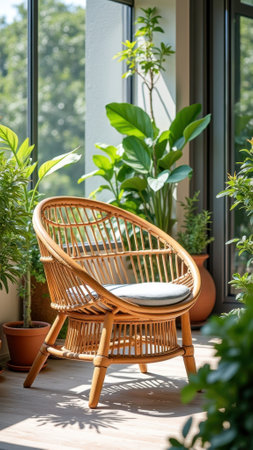 A serene indoor setting featuring a comfortable rattan chair surrounded by vibrant green plants, creating a harmonious and inviting atmosphere.