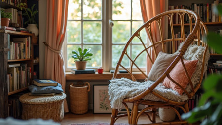 Cozy reading nook with rattan chair and bookshelf by sunlit window. That the image is generated using AI.