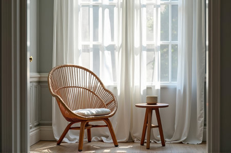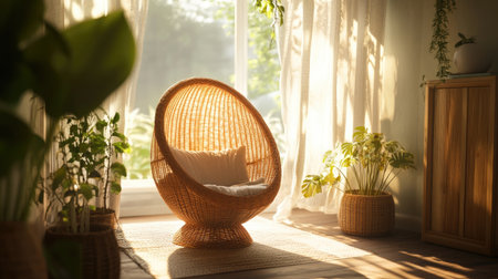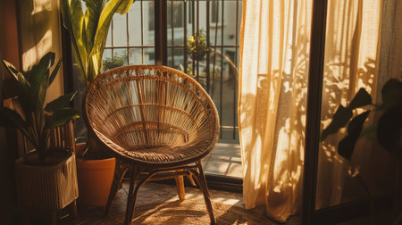 A stylish woven chair bathed in warm sunlight creates a cozy atmosphere. Surrounded by greenery and soft drapes, this serene space invites relaxation.