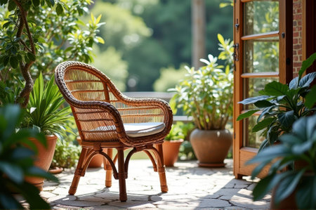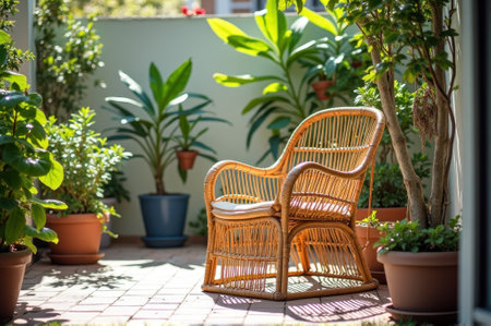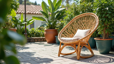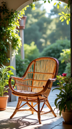 Sunlit rattan chair on a serene patio with lush greenery and potted plants. That the image is generated using AI.
