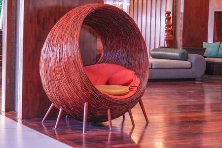 Rattan garden furniture on the terrace of a restaurant or hotel cafe. Outdoor furniture made of natural materials. Empty sits in the cafeteria in day.