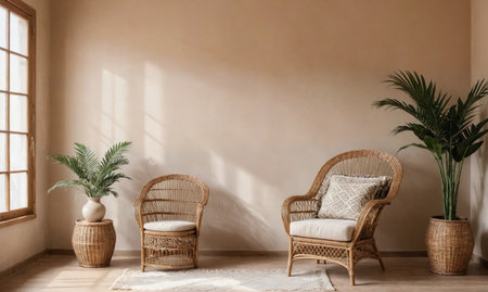 Warm sunlight fills a serene room showcasing a rattan chair and lush plants, creating a welcoming atmosphere.