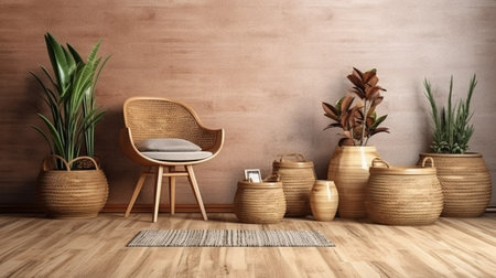 Modern home interior with rattan furniture and dry plant in vase 3d render