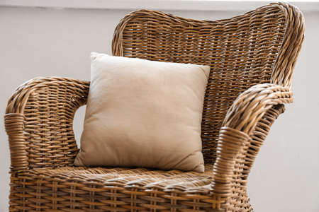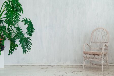 Brown wicker chair in vintage style on cement floor in white room with natural light.