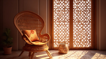 Arabic,Islamic style interior.Rattan chair,table and arabic pattern in window with shadow.3d rendering