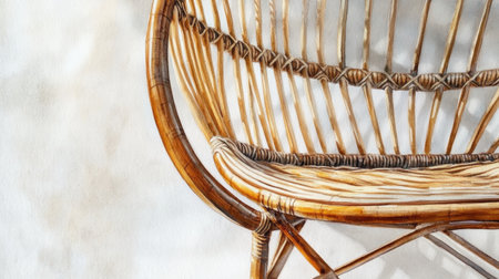 Close-up, low-angle shot of a traditional bamboo chair, showcasing its natural fibers and rich tones with a soft watercolor rendering to emphasize elegance.