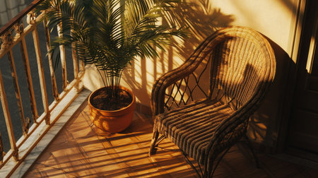 A detailed shot of a balcony corner, featuring a potted palm tree and a wicker chair, with the warm glow of the afternoon sun casting shadows.