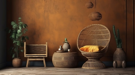 Blanket and pillows on rattan armchair next to plants. Boho and cozy interior of living room. Generative AI illustration