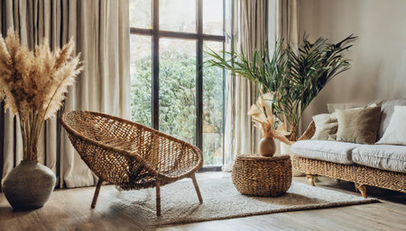 Interior design composition with a living room area in boho style with natural lighting and neutral colors. Residential interiors with chic decor.