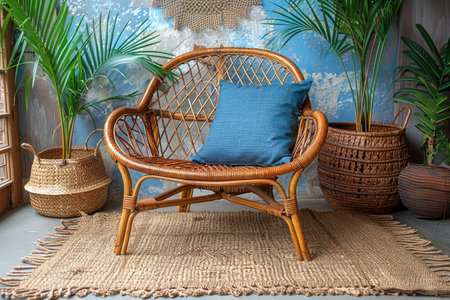 A rattan chair with a soft cushion is placed beside a potted plant, creating a warm and inviting atmosphere.