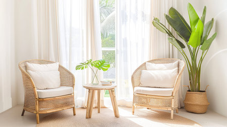 This inviting indoor scene features two rattan chairs with soft cushions, a small table, and a vibrant tropical plant by a bright window.