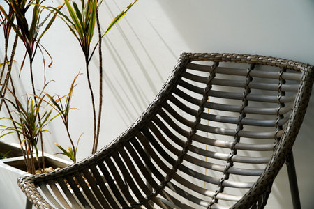 A serene indoor scene featuring a stylish rattan chair beside green plants. Sunlight casts beautiful shadows, enhancing a cozy atmosphere in a modern home.