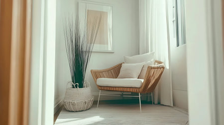 A warm and inviting space featuring a wicker chair with a cushion placed next to a leafy plant. Soft sunlight streams through large windows, creating a serene atmosphere.