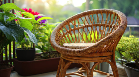 This charming rattan chair on a balcony is surrounded by lush green plants, creating a serene spot for relaxation and leisure in nature's embrace.