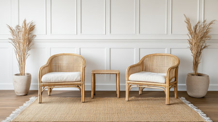 Interior scene with rattan chairs, a simple rug, and white walls in natural daylight