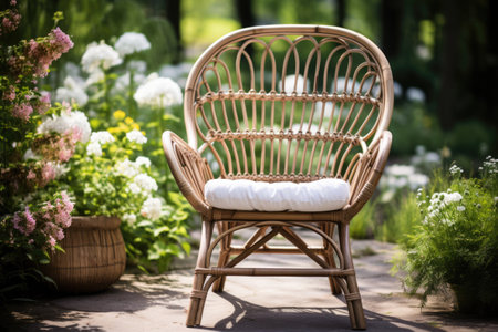 Cozy rattan chair in lush tropical garden surrounded by vibrant green foliage. That the image is generated using AI.