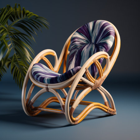 a wooden lounge chair with a vibrant floral print, rendered in the style of cinema4d. the chair features a shibori-inspired design with colorful curves, created using daz3d. the enigmatic tropics theme is enhanced by the light navy and purple hues, and the intertwining materials add an intriguing touch. ai generated