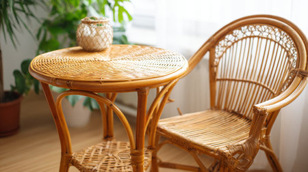 This cozy interior scene showcases a handcrafted rattan table and chair set, creating an inviting atmosphere ideal for relaxation and social gatherings.