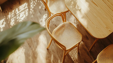 A serene wooden dining area filled with natural light, featuring elegant rattan chairs and a light wooden table. This stylish space embodies minimalism and comfort.