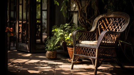 Serene sunlit patio with wicker chair and lush green plants. That the image is generated using AI.