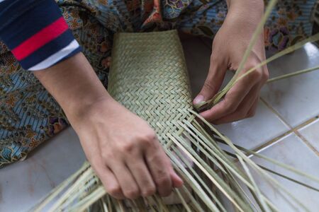 Thai traditional strips of bamboo weaving with human hands