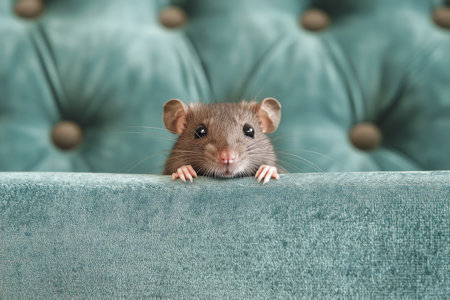 A small gray rat with prominent ears sits comfortably on a soft sofa, looking curiously at the viewer, with a bright yellow pillow nearby enhancing the cozy atmosphere.